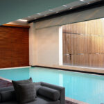 The glazed walls disappear into concealed compartments to open the pavilions to the northside patio and pool area.